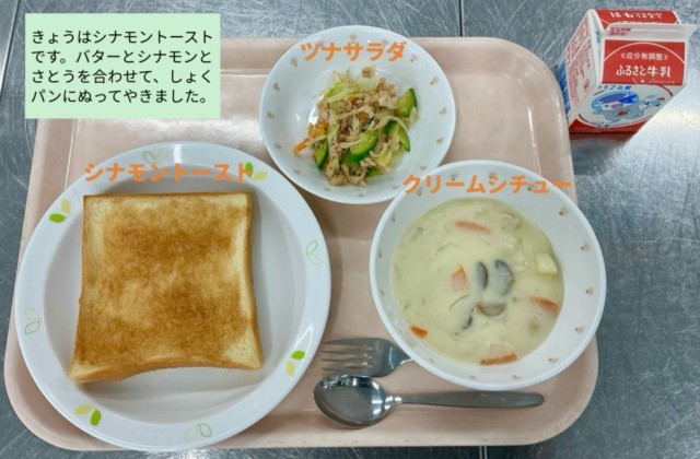 今日はシナモントーストです。バターとシナモンと砂糖を合わせて、食パンにぬって焼きました。