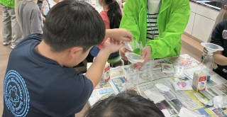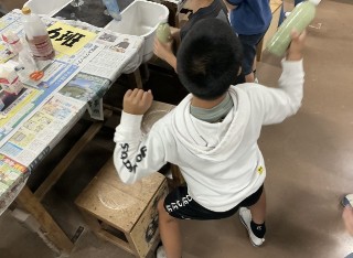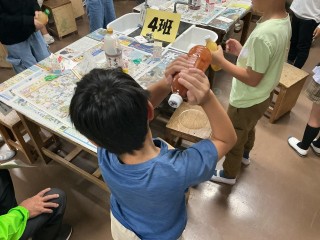 その後、給食で使われた廃油を使って石けん作りにチャレンジ! 子どもたちはペットボトルを一生懸命に振りながら、石けんができていく様子を楽しんでいました。