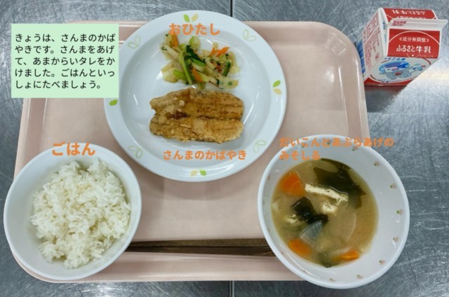 今日はさんまのかば焼きです。開きのさんまに、酒やしょうがで下味をつけてから油で揚げて、