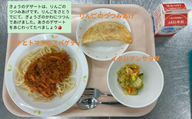 今日のデザートは、りんごの包みあげです。りんごを砂糖と一緒に煮て、ぎょうざの皮に包んであげました。