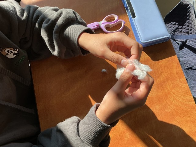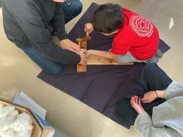 子どもたちは、自分たちが種から育てた綿を手に取り、「ふわふわしている!」と興味津々。綿くりでは、思ったより多くの種が出てくることに驚きながらも、道具の使い方を教わり、丁寧に綿と種を分けていました。