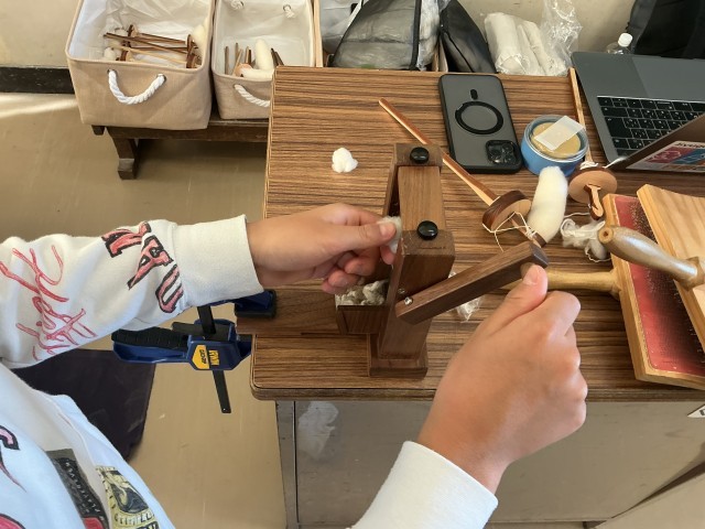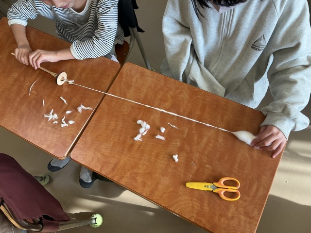 続いて行った糸つむぎでは、綿の繊維を少しずつ引き出しながら撚りをかけ、一本の糸へと変えていきます。初めての作業に苦戦する姿も多く見られ、「あっ、糸がちぎれてしまった!」と悔しがる声が上がる一方で、コツをつかむと「綿が本当に糸になるなんて面白い!」「もっと長くつむいでみたい」と笑顔が広がりました。
