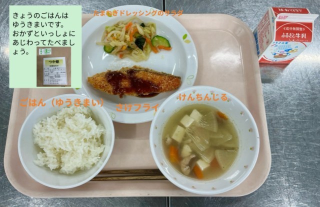 今日のごはんは有機米です。今日は秋田県で作られた「つや姫」というお米を使いました。