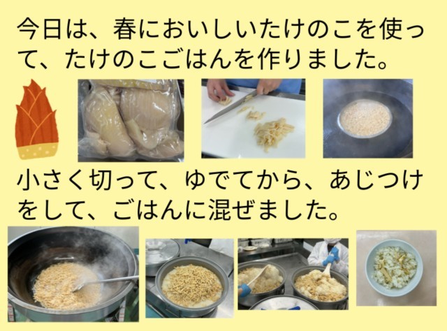 味つけをしてごはんと混ぜました。たけのこの食感や風味を感じながら、味わって食べていました。