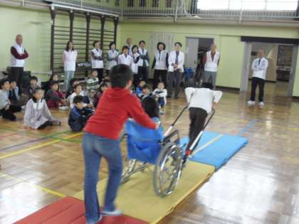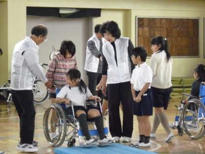 4年生は総合的な学習で「福祉」について学んでいます。今日は奥沢地区の社会福祉協議会の方々のご協力を得て、車椅子体験を行いました。
