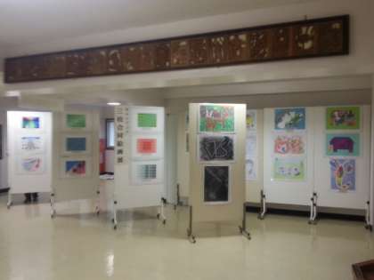 奥沢中学校、東玉川小学校、奥沢小学校の三校の児童・生徒が、図工や美術の時間に描いた絵画作品を、本校体育館前のロビーに展示しています。代表児童・生徒の作品を展示するこの絵画展は、三校を移動して行われ、今後、奥沢区民センターでの展示を予定しています。