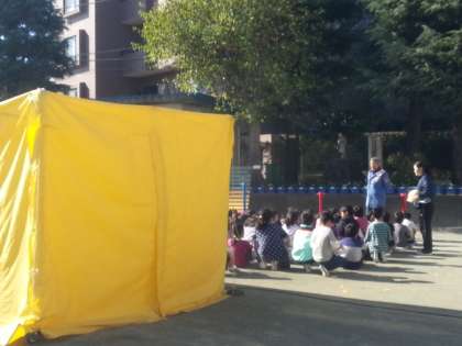 火災を想定した避難訓練の後、3年生が、煙の中の避難体験を行いました。区から特別な装置をお借りし、指導員の方から避難の仕方を学びました。