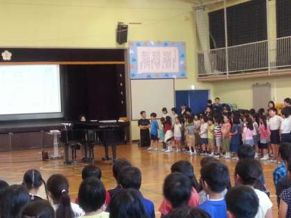 6月2日(木) 音楽朝会がありました。体育館に全校児童が集まり、グランドピアノを囲んで、声を合わせて合唱しました。みんなの歌声が体育館に広がりました。