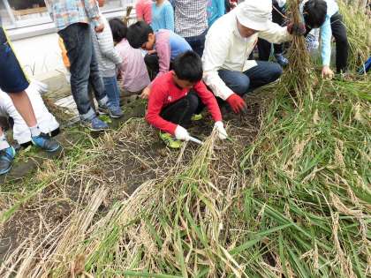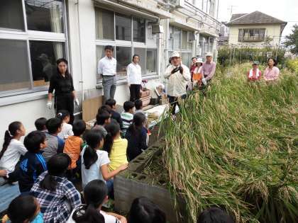 雨が心配されましたが、昨日10月5日水曜日4校時に稲刈りを無事行うことができました。地域の方々のご指導・ご支援により、学校の花壇3つを活用して春から米作りを行ってきました。専門家に教えていただいたおかげで、今年も豊作でした。5年生の子どもたちは、滅多にできない体験活動を意欲的に取り組んでいました。