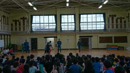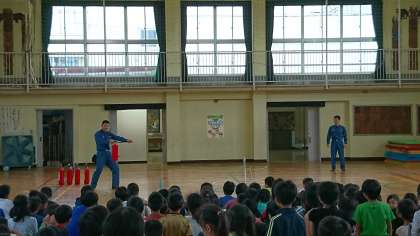 玉川消防署奥沢出張所の皆さんにご指導をいただき、消火器を使った初期消火訓練を行いました。火事を発見したら、先ずは大声で知らせること。その上で、消火器などを使って消火活動をすることなどを学びました。