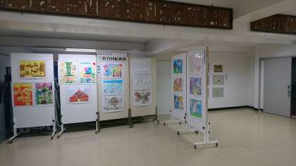 体育館前のロビーに、奥沢中学校、東玉川小学校、奥沢小学校の児童が描いた絵画の代表作品を展示しています。この作品は、3校を巡回して展示します。他校の児童や中学生の作品を見ることで、新たな発見が生まれことを期待しています。