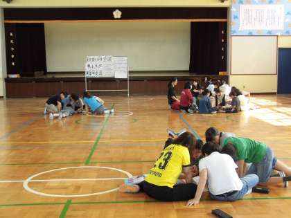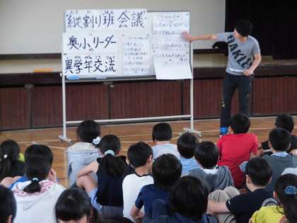 本校の特色である縦割り班活動は、1年生から6年生までが一つの班(縦割り班)をつくり、一緒に遊んだり、給食を食べたりします。この活動の中心は6年生です。この日は6年生全員が、活動の進め方についてのレクチャーを受けました。そのあと、6年生が班に分かれて、活動計画を立てました。いよいよ、今年度の活動のスタートです。