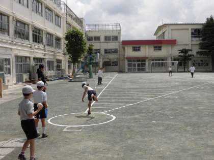 本校の体力テストは、高学年と低学年がペアになって行います。高学年の子どもたちが、低学年を誘導したり、記録をメモしたりします。一人ひとりが自己ベストを目標に、昨年度の自分の記録を上回ることにチャレンジしました。