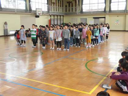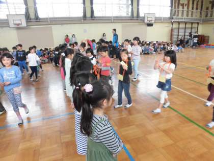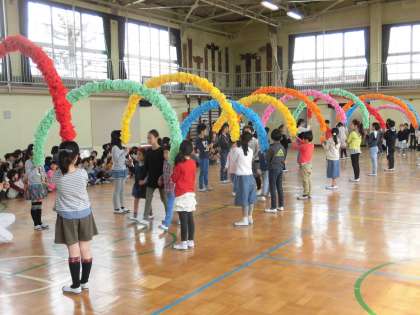 会では、2年生からのプレゼントや3年生からの出し物などがあり、1年生は笑顔いっぱいでした。最後は、4年生の花のアーチを通り退場しました。