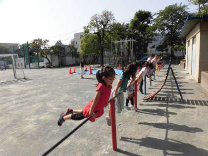 朝の時間に、低学年が様々な運動に取り組みました。鉄棒運動や長縄跳び、そしてフラフープ。気もちの良い汗を流し、頭もすっきりしました!