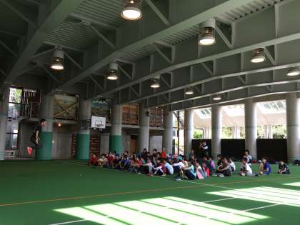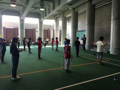 補助員の藤沢先生が、なわとびのいろいろな技を披露してくれました。子どもたちは感動し、藤沢先生のなわとびに夢中でした。その後は、跳ぶ技、ポーズの仕方を教えてもらいました。