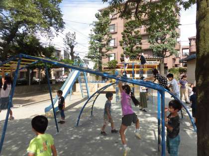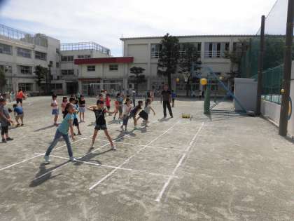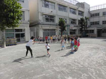 校庭では、固定遊具遊びや鉄棒、長縄跳びに的当てをしました。