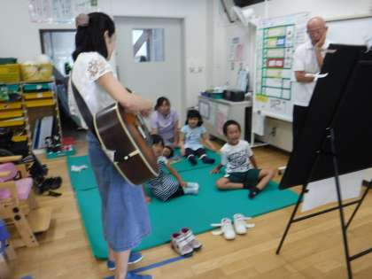 水曜日の音楽は、季節の歌やパネルシアターです。濱田先生のギターの響きは子どもたちにとって、発声がしやすいようです。「にじ」「世界に一つだけの花」に次いで、つくしの子どもたちの大好きな歌の1つになりそうな「ありがとうの歌」との出会いになりました。