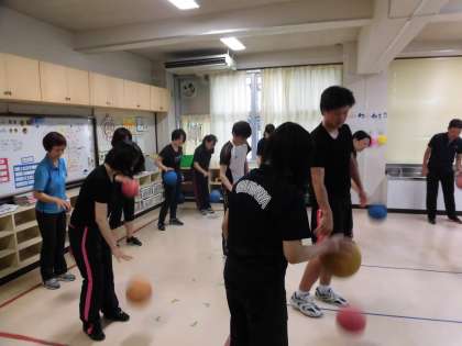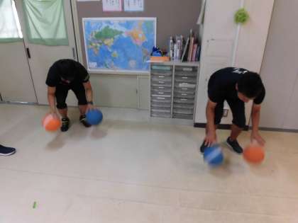 両手で2つのボールをドリブルすることやボールを上に投げあげて拍手をしてキャッチする運動をしました。