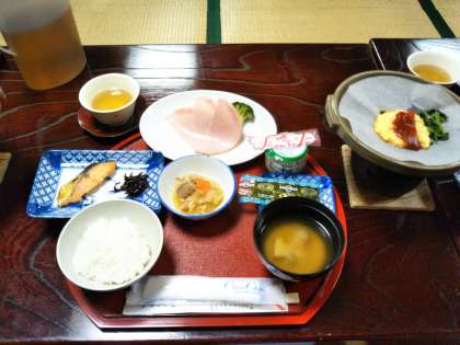 奥小ストレッチ、朝会を終えて、朝ごはんです。ハイクングに向けてもりもり食べましょう!