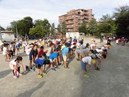 青空のもと、たくさんの子供たちが集まり、奥沢小学校の校庭でラジオ体操が行われました。朝早起きすると、気持ちがいいです。