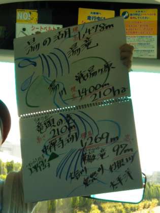 閉園式を終え、日光江戸村に向かっています。バスの中では、ガイドさんが手書きのフリップを見せながら日光豆知識や、♪ででん♪と言って日光クイズを毎回出してくれます。