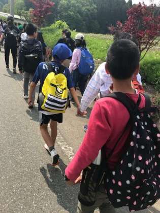 前の子が手を引き、後ろの子が背中を押してあげています。
