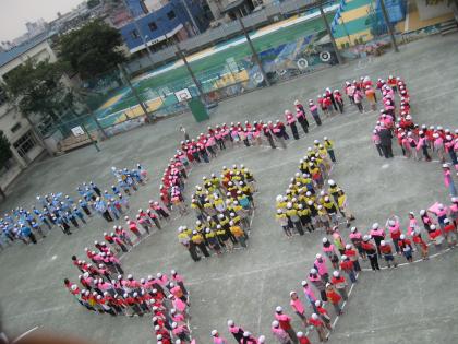 11月28日(金)に“75周年を祝う会”を行います。それに合わせて、校庭に全員で人文字を描き、航空写真を撮りました。その後、子どもたちと教職員で集合写真を撮りました。