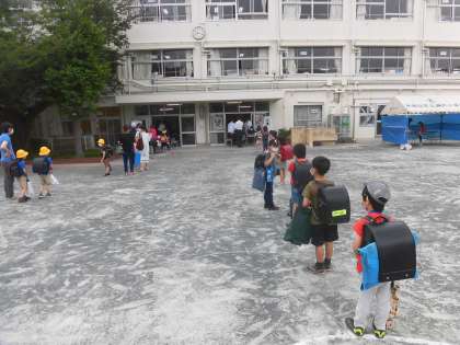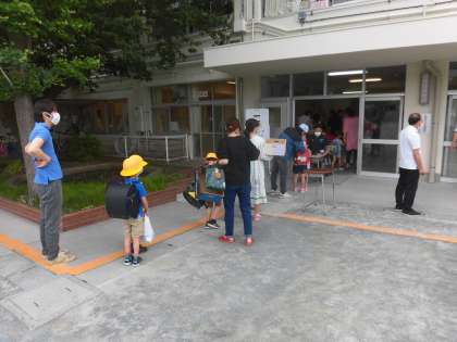 昇降口前で、まいあさ検温票の確認をしてから下駄箱に向かいます。確認をするために、児童は適切な距離を保って並びます。