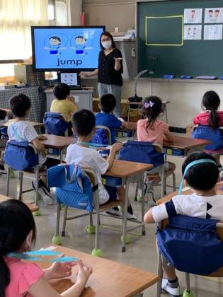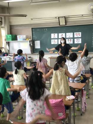 ALTのアルマ先生との授業は2回目です。1回目は気持ちの表し方、2回目の今日は、いろいろな動きを習いました。音楽を聴いて体を動かしたり、ゲームをしたりしながら、楽しく学習しました。