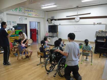 音楽の授業では、ピアノの演奏に合わせて、みんなでタンバリンをたたきました。笑顔で楽しく活動に取り組みました。