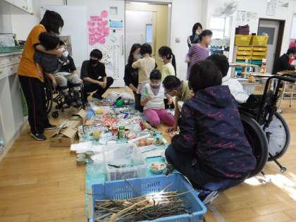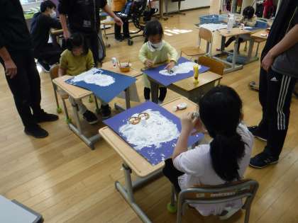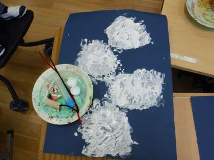 図画工作では、雪だるまの絵を描きました。手にいっぱいの液体粘土を付け、思い思いの雪だるまを描きました。さらに、ボタンやキャップなど様々な材料から選び、顔を表現しました。