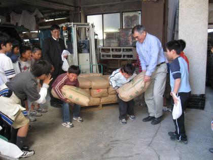 奥沢小学校学校協議会委員でもある地域のお米屋さん(福田さん)にご協力をいただき、本校の水田で育てていた稲を刈り、先日脱穀しました。今日はそのお米を持って行き、福田さんのお店で精米していただきました。精米したばかりの米をさわったり、ぬかの甘みを味わったりと短い時間でしたが、多岐にわたって経験させていただいたり、教えていただいたりしました。最後には一人一人30㎏の米袋を運んで、仕事の大変さの一端を知ることができました。福田さん、ありがとうございました。