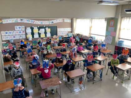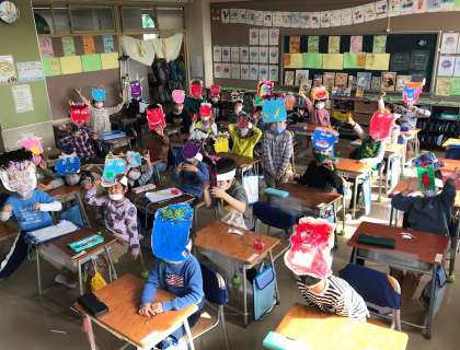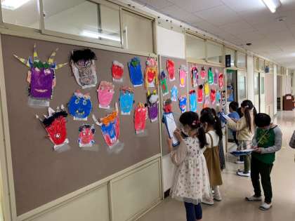 鬼のお面をつけてパチリ。作品の鑑賞もしました。「はなが大きいのがいいとおもいました。」「目のいろがむらさきで、こわく見えました。」友達の作品のステキを見つけるのも上手です。