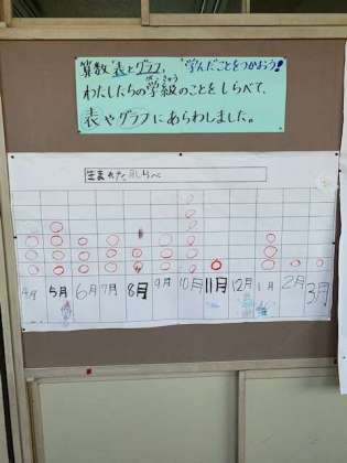 算数「表とグラフ」で学んだことを生かして、自分たちの学級のことを調べ、表やグラフで伝える学習をしました。