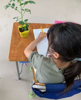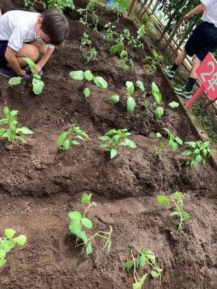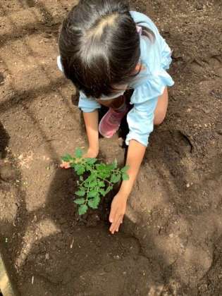 トマト、ミニトマト、ナス、ピーマン、枝豆の苗を観察し、学校の花壇に植えました。