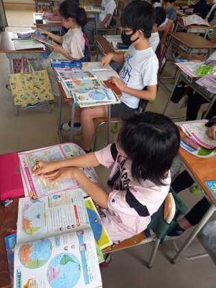 5年生の社会科では、地図帳、教科書、ノートと多くの教材を扱いながら、日本地理を学習しています。