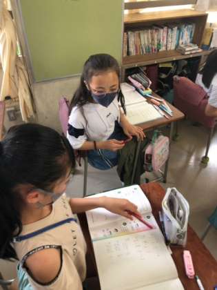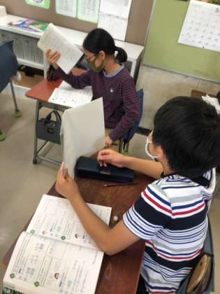 ノートを見せ合ったり、自分の説明と異なる場面を聞き直したりしながら、学習を深める姿が見られました。