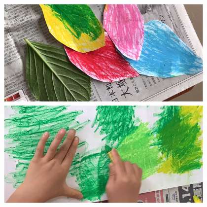 紫陽花の葉をこすり出しで、花は折り紙で作りました。雨の季節といえば?と、みんなでイメージを膨らませながら、カエルや傘の絵も描き加えました。