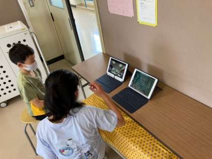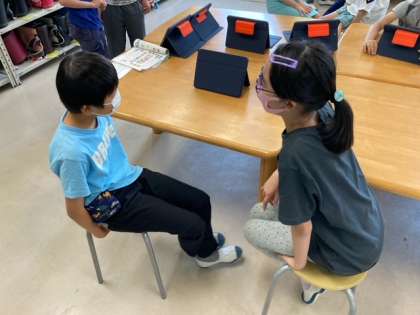 今日は、英語を使ってペアでコミュニケーションをとる練習をしました。自分たちのやりとりをタブレットを使って録音して、振り返りに生かしました。