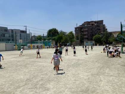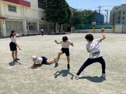校庭では、おにごっこや縄跳びで遊んでいます。最近とても暑く日差しが強いので、水分補給をこまめにできるよう声掛けしていきます。