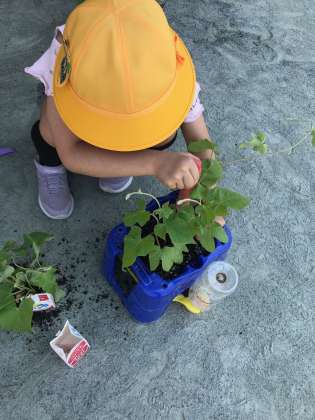 アサガオがずいぶんと大きくなってきました。植木鉢には2本残し、あとは家に持ち帰ったり、花壇に植えてグリーンカーテンにすることにしました。