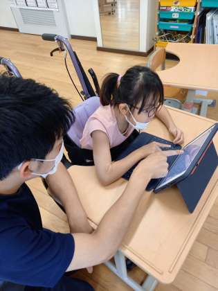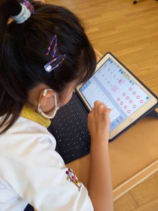 1メートルものさしの長さに驚きの声をあげたり、タブレットを使いこなして足し算をしたり、意欲的に学習しています。