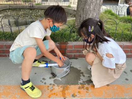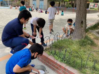 空気鉄砲を使って、水や空気の性質について学んでいます。実験からの子どもたちの気付きを大切にしていきます。