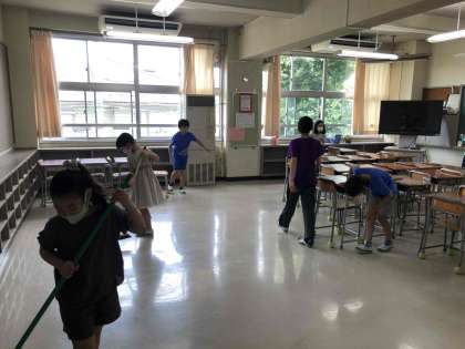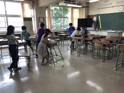 学習室には,たくさんの机・椅子があります。掃除の手順にそって手際よく自分の仕事をこなしながら,机・椅子をみんなで協力して運んでいます。