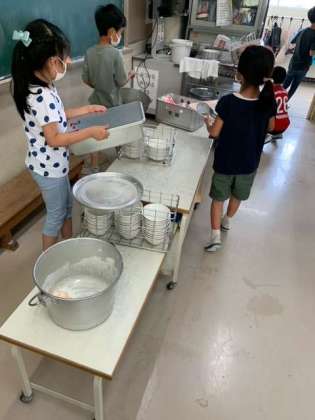 片付けのとき、空になった食缶をワゴンにのせるのも上手になりました。