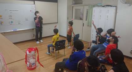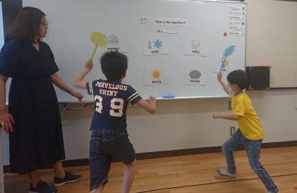 「How's the weather ?」の質問に「I know !(わかった!)」と次々に手を挙げる子ども達。