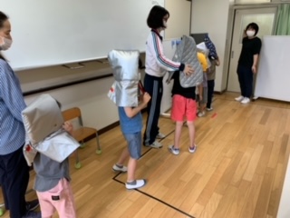 地震発生の想定で、揺れがおさまるまで机の下にもぐってダンゴムシポーズを取ることができました。防災頭巾を被って並ぶ練習でも、おしゃべりせずに素早くできるようになってきました。