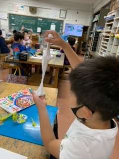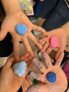 先ずは、紙粘土体操です。しっかりと、揉んで伸ばしてたたんで…繰り返していくと、柔らかくなり、よく伸びるようになります。そして絵の具を練り込んで、カラフル粘土の出来上がりです。