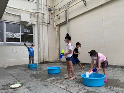 『キャンプごっこ』第二日目は、水遊び、キーホルダー作り、ローラーブレードに挑戦することでした。帰りの会で今日楽しかったことを聞くと、「全部です!」の声。自分のたちがやってみたかったことをたくさん叶えた低学年チームでした。